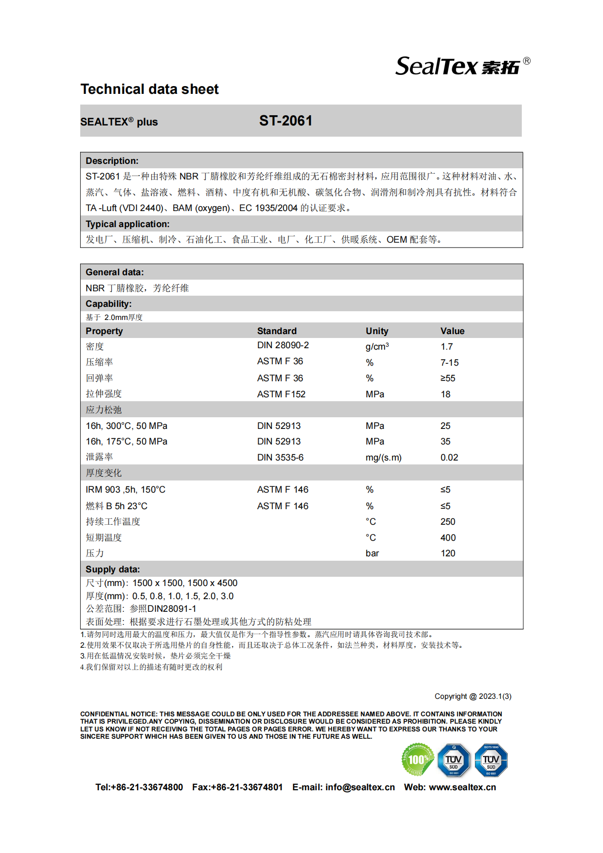 ST-2061 是一種由特殊 NBR 丁腈橡膠和芳綸纖維組成的無石棉密封材料,應用范圍很廣。這種材料對油、水、