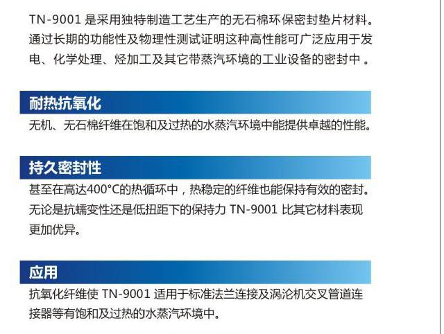 TN-9001是采用獨特制造工藝生產(chǎn)的無石棉環(huán)保密封墊片材料,通過長期的功能性與物理性測試證明這種高性能可廣泛應用于發(fā)電、化學處理、烴加工及其它蒸汽環(huán)境的工業(yè)設備的密封中。