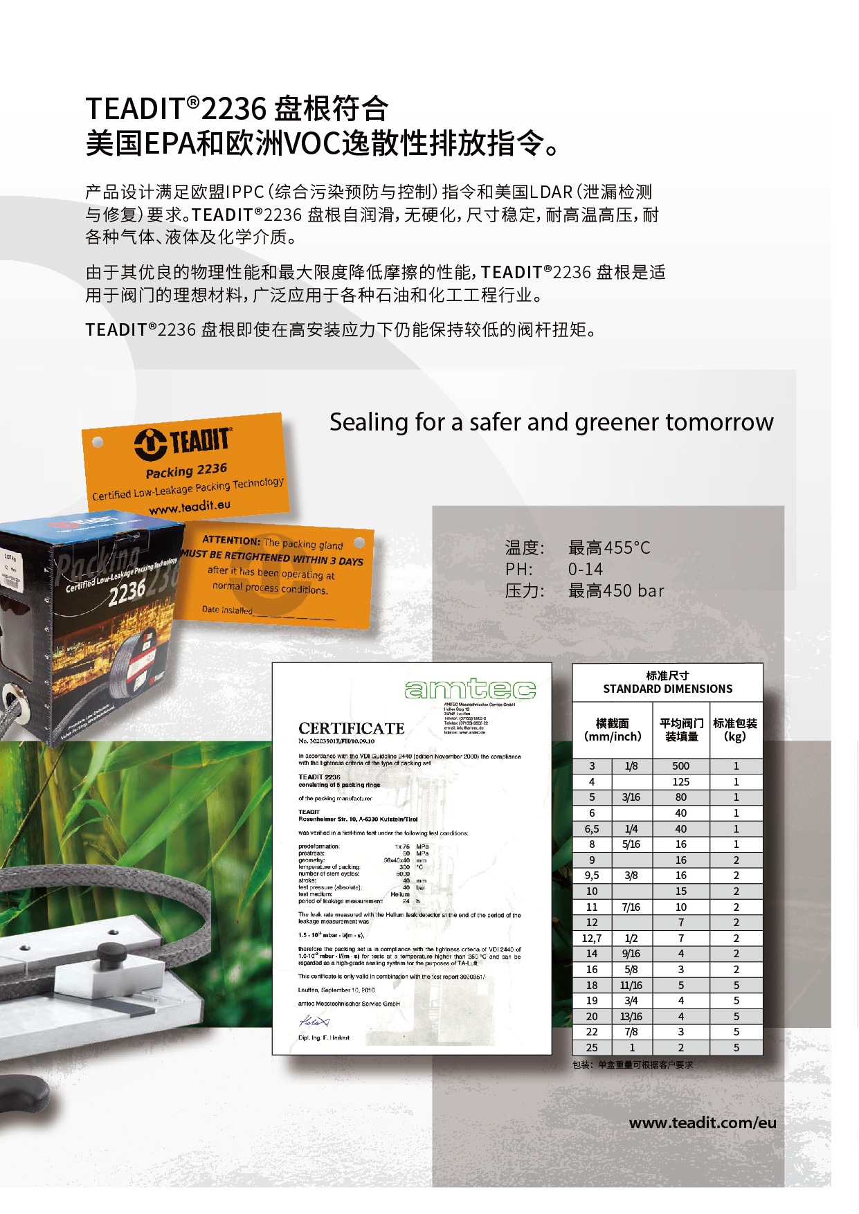 TEADIT® 2236 盤根具有自潤(rùn)滑、非硬化、尺寸穩(wěn)定、耐氣體和流體、耐熱、耐壓和耐化學(xué)腐蝕等特性。它的高溫柔性石墨和 Inconel® 長(zhǎng)絲護(hù)套具有機(jī)械穩(wěn)定性,先進(jìn)的結(jié)構(gòu)可在蒸汽服務(wù)中實(shí)現(xiàn)泄漏控制和高完整性。產(chǎn)品設(shè)計(jì)滿足歐盟IPPC(綜合污染預(yù)防與控制)指令和美國(guó)LDAR(泄漏檢測(cè)與修復(fù))要求。